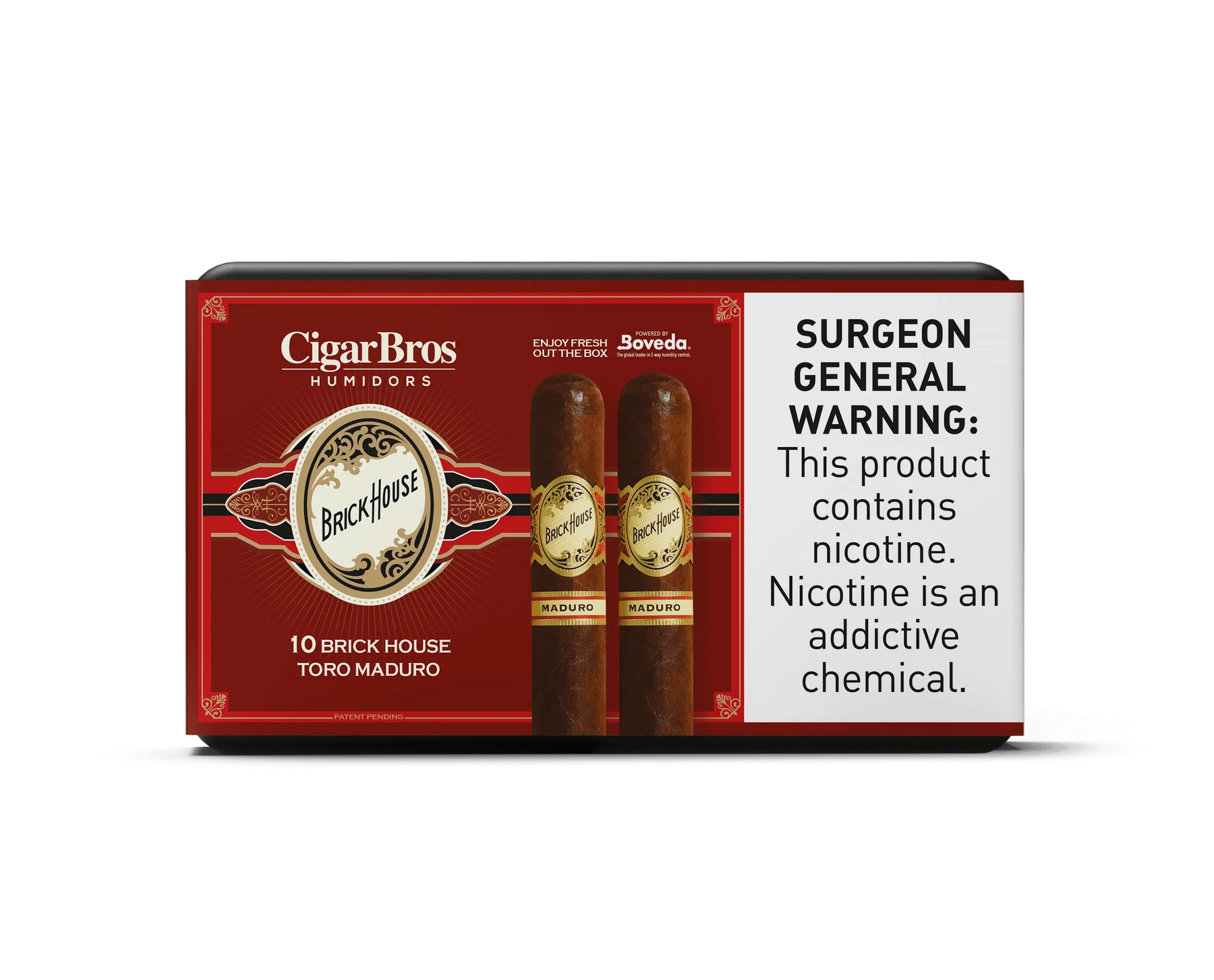 A black Brickhouse by CigarBros personal humidor box is open, showing a Boveda 69% RH pack inside. Text highlights the humidity pack for premium cigar storage, and the CigarBros logo appears at the bottom.